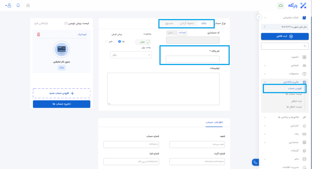 مالی و بانکداری در چرتکه شامل بانک، تنخواه گردان و صندوق می باشد. بانک ها، حساب های بانکی هستند و تنخواه گردان به کسی گفته می شود که مبلغی را در اختیار دارد و آن مبلغ را برای مقاصد خاصی خرج میکند. همچنین صندوق همان وجه نقد می باشد. برای تعریف یک بانک از منوی مالی و بانکداری زیر منوی افزودن حساب انتخاب می شود. کد حسابداری بانک ها، صندوق ها و تنخواه گردان ها هم مشابه کد کالا و اشخاص می باشد که می توانید کد را به صورت دستی یا اتوماتیک در نرم افزار تعریف نمایید. با برداشتن تیک گزینه فعال بانک مورد نظر غیر فعال شده و به این معنی است که در هر بخش از نرم افزار که نیاز به انتخاب از لیست بانک ها باشد اسم بانک در لیست نمایش داده نخواهد شد. تمامی موارد اعم از شعبه، شماره حساب، شمار کارت، شماره شبا و واحد پول کاملا اختیاری و تنها نام بانک از فیلدهای اجباری در این بخش می باشد. همچنین می توان بانک مورد نظر را به کمک گزینه پیش فرض به عنوان بانک اصلی فعال نمود. با انجام این کار در تراکنشات به صورت پیش فرض بعد از انتخاب بانک، نام بانک پیش فرض ظاهر می شود. در نهایت با کلیک روی دکمه ذخیره اطلاعات می توان بانک مورد را اضافه نمود.