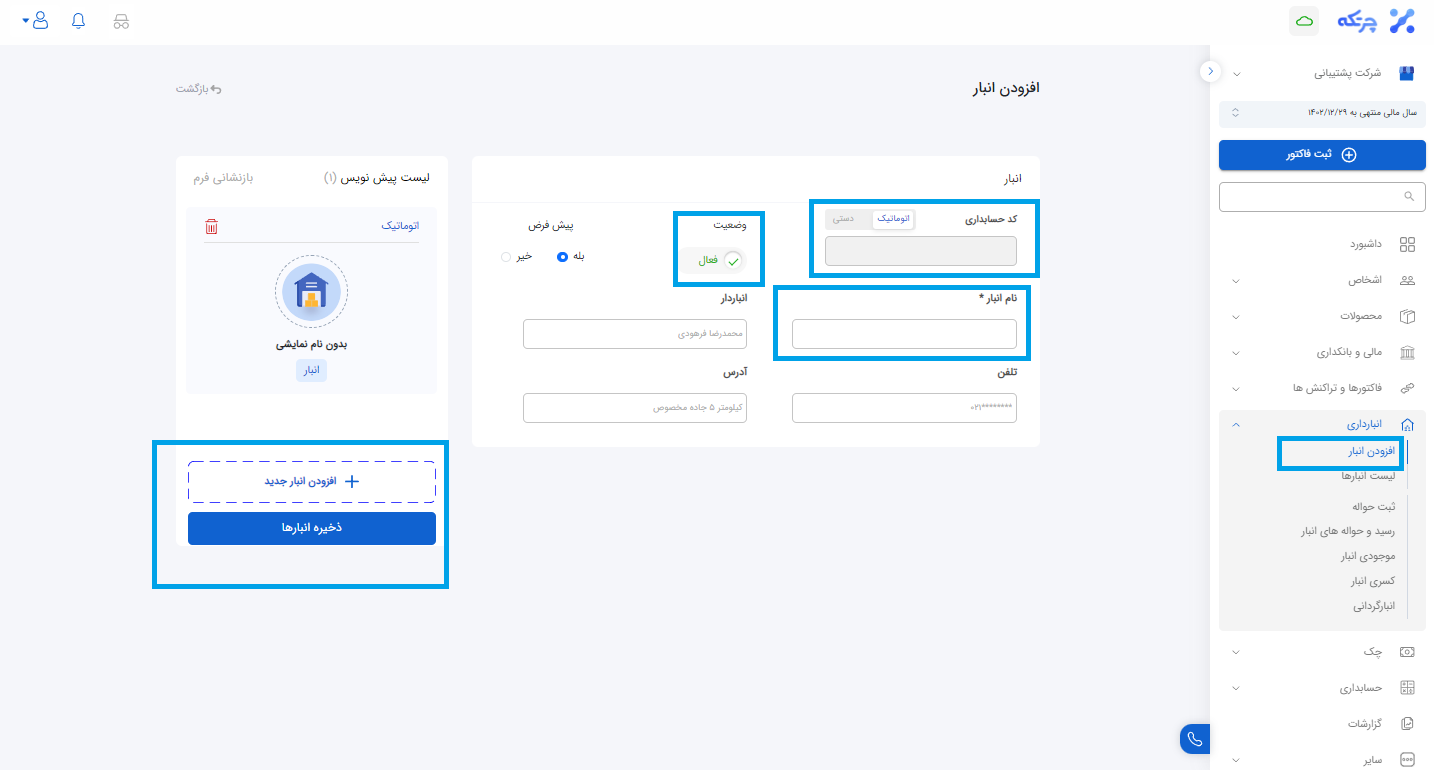 برای اضافه کردن یک انبار جدید در نرم افزار حسابداری چرتکه، از منوی انبارداری روی گزینه افزودن انبار کلیک نمایید و در صفحه مشخصات انبار اطلاعات آن را وارد میکنیم. تنها فیلد اجباری در این صفحه نام انبار می باشد. با فعال کردن گزینه اتوماتیک کد، کد حسابداری به صورت اتوماتیک توسط خود نرم افزار تعریف خواهد شد. با غیرفعال کردن آن و انتخاب حالت دستی، کد حسابداری را می توان تعیین کرد. اگر به تازگی شروع به استفاده از نرم فزار چرتکه کرده اید، پیشنهاد می شود برای کاربری آسان تر از کد حسابداری اتوماتیک استفاده شود. با برداشتن تیک گزینه فعال، آن انبار در نرم افزار غیر فعال می شود یعنی به این معنی که در هر بخش از نرم افزار که نیاز به انتخاب نام این انبار از لیست باشد، اسم انبار در لیست دیده نخواهد شد. در نهایت روی گزینه ذخیره انبارها کلیک خواهیم کرد.