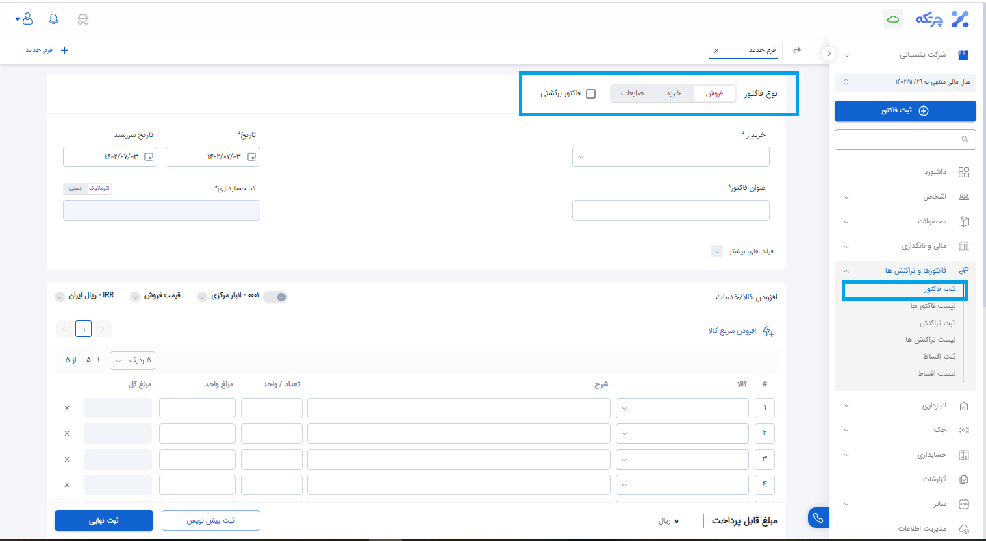 برای ثبت یک فاکتور جدید در چرتکه از منوی فاکتورها و تراکنش ها، ثبت فاکتور را انتخاب می کنیم و نوع فاکتور که بر اساس فاکتور فروش، خرید و ضایعات می باشد را در تب های زیر بنابر خواسته خودمان مشخص می کنیم.
