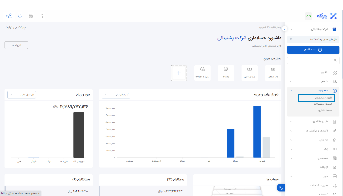 تعریف کالای جدید در چرتکه از منوی محصولات و گزینه افزودن محصول انجام پذیر است به طوریکه تمامی موارد اعم از کد حسابداری، نام کالا، بارکد، کد کالا و … در این بخش تعریف خواهند شد.